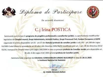 Seminarul a fost organizat de Colegiul Consilierilor Juridici București și s-a desfășurat la Institutul Național de Statistică. La finalul programului, participanții au primit diplome de participare, conform cerințelor profesionale aplicabile.