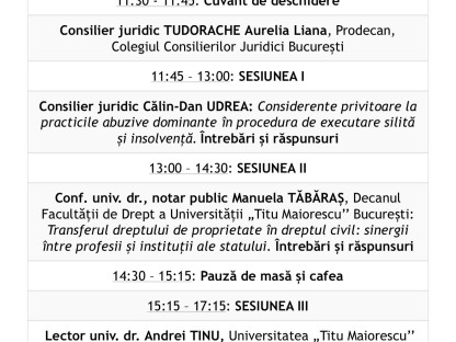 12.45– 14.15– Notar Public Manuela TĂBĂRAȘ – Decanul Facultații de Drept a UNIVERSITĂȚII ”TITU MAIORESCU’’ BUCUREȘTI – cu tema: